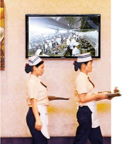 兩名服務員端著剛剛出鍋的菜肴,走過實時顯示廚房內情景的監控屏幕