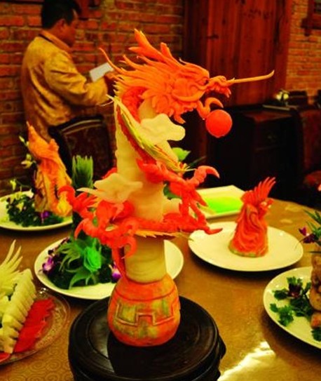 制作“中華龍”的涼菜名廚說,涼菜拼盤的制作過程,最考究的是廚師的藝術靈感和精湛、熟練的手工操作程度。自己從事廚師工作12年來,所用于練習涼菜雕刻的蘿卜、南瓜、芋頭、萵筍等果蔬已達到3萬多斤。
