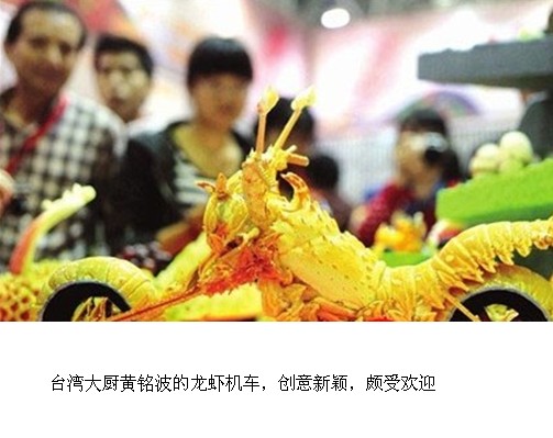展臺上還有西瓜雕刻的孔雀、鹽巴堆成的七巧板、龍蝦殼做的哈雷摩托……這些充滿創(chuàng)意的食材造型吸引了很多人。