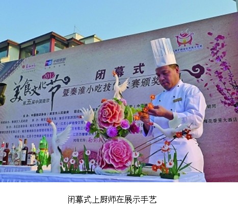 此次美食節(jié)閉幕式,不但集中展示了蟹黃湯包、蜜汁藕、麻團(tuán)、回鹵干等“2012秦淮小吃大賽”的獲獎(jiǎng)作品,還現(xiàn)場(chǎng)舉行了“第五屆中國(guó)南京美食文化節(jié)金陵名廚”大賽。10名來(lái)自江蘇酒家、真知味、小廚娘、漢府飯店等知名飯店的大廚,現(xiàn)場(chǎng)以“菊花魚”為題,PK廚藝。