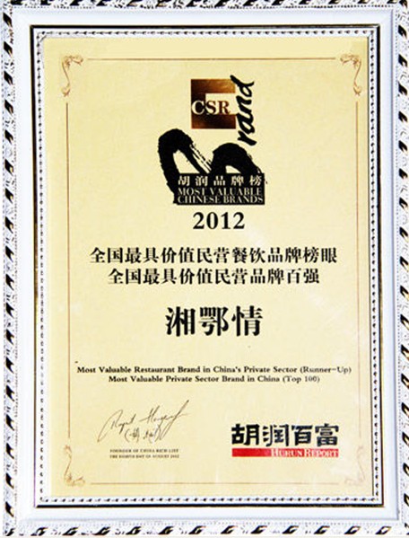 胡潤(rùn)研究院近日發(fā)布《2012中國民營(yíng)企業(yè)品牌排行榜》暨《2012胡潤(rùn)品牌榜》,榜單對(duì)100個(gè)中國最有價(jià)值品牌按照其品牌價(jià)值進(jìn)行排名。今天記者從湘鄂情集團(tuán)獲悉,其昨天剛剛拿到2012全國最具價(jià)值民營(yíng)餐飲品牌榜眼的證書。