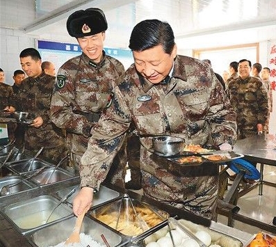 2014年1月26日,習近平在內蒙古軍區(qū)邊防某團一連食堂排隊就餐。