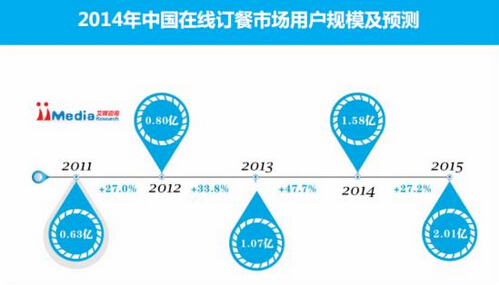 iiMedia Research數據顯示,2013年中國在線訂餐市場用戶規模達到1.07億,預計2014年中國在線訂餐用戶規模將達到1.58億。