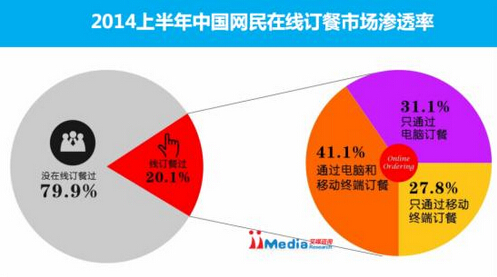 iiMedia Research數據顯示,2014年上半年中國網民在線訂餐滲透率達到20.1%。在訂餐網民中,有27.8%只通過手機、平板等移動終端進行訂餐,只通過電腦訂餐的占31.1%。