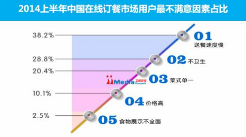 iiMedia Research數據顯示,38.2%的用戶將送餐速度慢列為在線訂餐最不滿意的因素,其次是不衛生,有28.8%的用戶將其列為最不滿意的因素。