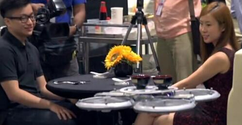利用無人操控飛行器科技概念,Infinium Robotics公司研發(fā)出“自助無人操控飛行托盤”,服務(wù)生只要預(yù)先輸入桌號后,把食物放在托盤上,托盤就會自動飛行到客人附近。