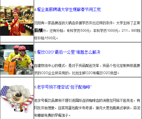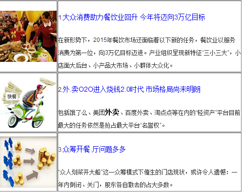 老字號狗不理包子引進咖啡連鎖店,包子配咖啡的混搭引起網友熱評;臨近春節,餐飲服務員緊缺,有餐企特別歡迎大學生寒假兼職餐館服務員,并給予特殊補貼;據統計,2014年餐飲業收入數據終于回升,2015年將向3萬億目標邁進。