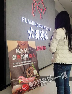 位于南岸區(qū)時(shí)代星光廣場(chǎng)的火舞炭燒主營(yíng)炭燒、烤肉,他們打出的廣告詞是———情人節(jié),就不接待情人(如圖)。“我已經(jīng)給服務(wù)員打好招呼,遇到手挽手成雙成對(duì)的恕不接待。”老板蔡彥旭,情人節(jié)不能只有耍朋友的開(kāi)心了,單身的人悲傷度過(guò)。他準(zhǔn)備唱反調(diào)到底,他還會(huì)給屆時(shí)前來(lái)就餐單身人士準(zhǔn)備一份禮物。