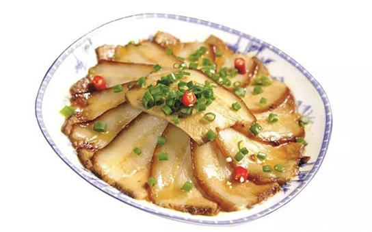 大致做法:1、帶皮五花肉刮洗干凈,改成大方塊,冷水下鍋焯透,撈出晾干。2、將晾好的五花肉抹上一層老抽,再次晾干之后入六成熱油炸至上色,撈出后投入五香醬湯中,小火鹵3小時,撈出晾至溫熱時,包上保鮮膜定型,放涼備用。3、客人點菜后取醬肉切片,碼入墊蔥絲的盤中,淋上少許東古一品鮮醬油,入蒸箱蒸3分鐘,撒蔥花即可上桌
