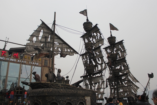 這家火鍋店的負(fù)責(zé)人告訴記者:“除了火鍋口味保證地道與原汁原味之外,我們玩的就是一個電影噱頭。”重慶是火鍋的重要發(fā)源地,火鍋又包含著重慶的碼頭文化,而電影《加勒比海盜》為觀眾一直熱追,所以設(shè)計團(tuán)隊就決定用加勒比海盜船的模型來布置餐廳場景,并以“坐在船上吃火鍋”為餐廳主題。