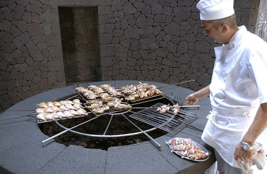 隨著夏日的臨近,燒烤季已經(jīng)來臨,但相信西班牙加那利群島(Canary Islands)的“魔鬼”餐廳(El Diablo)會帶給你不一樣的體驗。這家餐廳將烤肉架放在火山地?zé)峥谔帲柚?50到500攝氏度的高溫地?zé)峥救夂涂爵~。