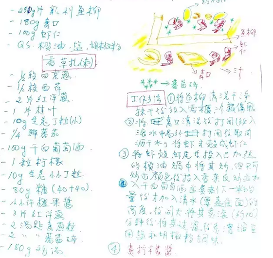 阿KEN的手繪菜譜很有藝術感,除了常規的做法之外,還有菜品擺設的外觀圖。徒弟們看過之后,就能做出同樣效果的菜品來。