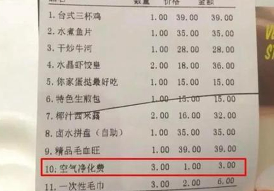 原來,該餐廳為優(yōu)化用餐環(huán)境,購置了空氣凈化器凈化餐廳空氣。為彌補設備及運營費用,便自作主張在餐費之外加收每位1元的“空氣凈化費”。