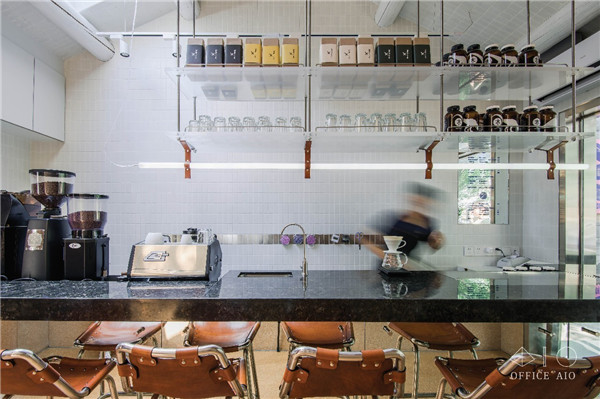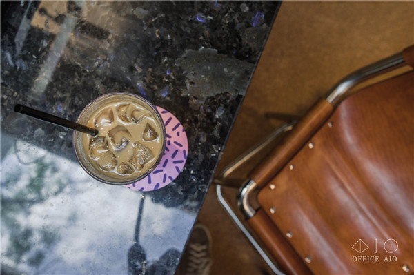 因為空間面積有限,很容易被“一眼看透”,因此在一些地方增加細碎感的設計反而可以為空間提供更多“信息量”,讓顧客的目光被不同的細節(jié)吸引,增加空間的層次和趣味,比如杯墊和糖罐上就是色彩和排版上比較活潑的設計,還有門把手、高腳凳、燈管懸吊處的天然皮革定制配件。