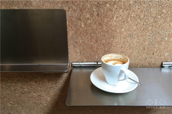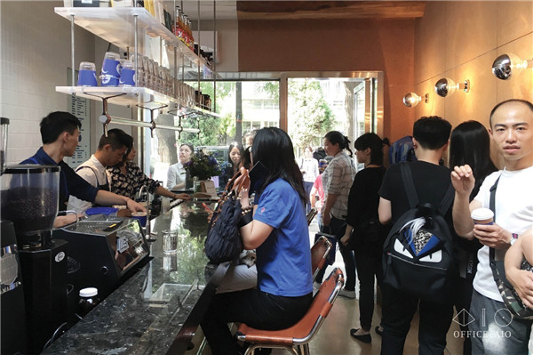 墻邊的不銹鋼板適合趕時間的顧客站立享用飲品,或等待時使用;吧臺延伸到門外的平臺,也為戶外提供了座位/站位。店中座椅選擇了高腳皮椅,店外水泥平臺上特意劃分了不在主動線上的兩個區(qū)塊,以不銹鋼板覆蓋,變成了應付過多客流的臺階座位。說實話都不是“久坐之處”,這樣設計明確的空間,客人自然不會當它是“閑來無事躺上半天”的地方。