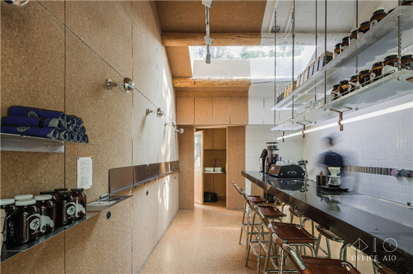 整個狹長的空間里,規(guī)劃了幾條非常清晰的動線,先是以吧臺為中心一分為二的整體空間,具有吸音效果的軟木墻背后是鄰居住家,而白色的咖啡師操作空間背后則是理發(fā)店,盡量做到鄰居之間互不影響。