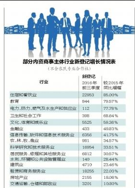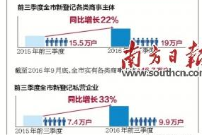 數(shù)據(jù)顯示,前三季度,全市新登記各類商事主體19萬戶,同比增長22%,新登記商事主體增速為近兩年來最高。截至2016年9月底,全市實有各類商事主體146.7萬戶,高出全國平均增速8個百分點。
