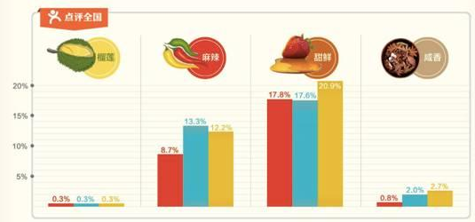 《中國(guó)餐飲報(bào)告(白皮書2017)》的最新數(shù)據(jù)顯示:2016年,甜鮮口感的受歡迎程度已經(jīng)小勝麻辣這一記憶度最高的口感。