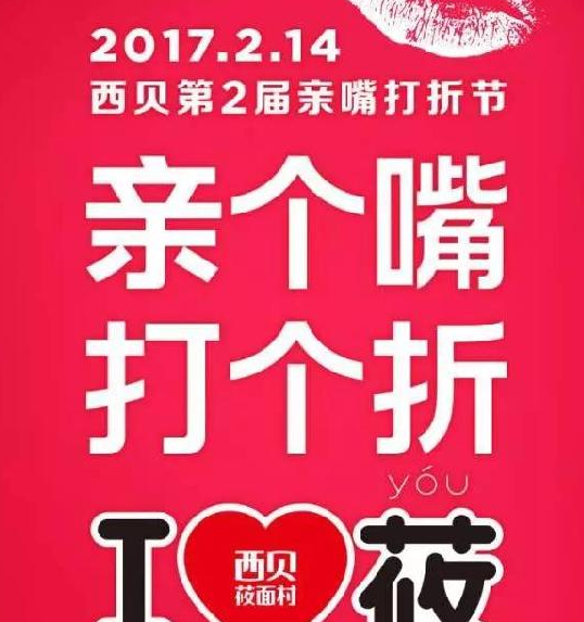 西貝2017年2月14日情人節的活動宣傳海報主題——親個嘴,打個折。