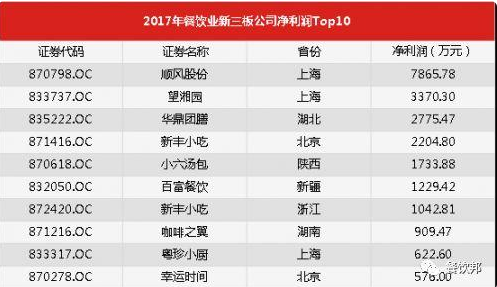 餐飲新三板也有好企業(yè):2017新三板餐飲企業(yè)凈利潤Top10