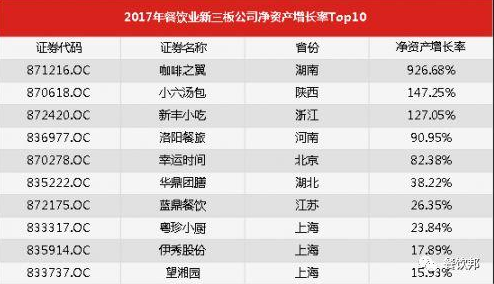 2017年餐飲業(yè)新三板公司凈資產(chǎn)增長率Top10榜單如下: