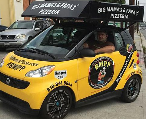 Big Mama‘s&Papa’s曾使用傳統(tǒng)的貨車來運(yùn)送巨型披薩,但如今它已經(jīng)擁有了專門的定制車輛。車身為黃色和黑色,印有連鎖店的電話號(hào)碼和網(wǎng)站名稱,某些部位還寫有“Big Mama&Papa‘s”的標(biāo)志。最引人注目的是車頂上安裝著巨大的收納箱,運(yùn)送期間可以放置巨型比薩。