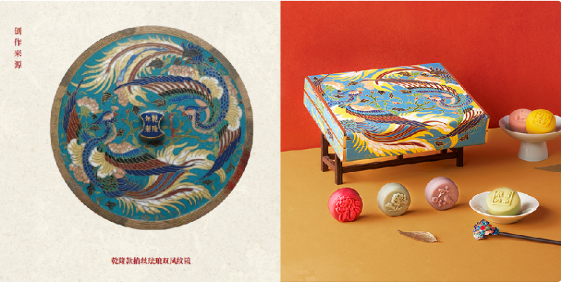 繼去年的“風雅頌”主題月餅后,今年,繼續延續“中國風”,產品設計從古董瓷器、掐絲琺瑯、宋徽宗喜愛的字畫等文物中獲得靈感,將傳統文化融入月餅。僅僅兩款禮盒的產品名稱,就足以使人腦補出中秋月朗、石榴滿園,鳳凰于飛、??其羽的?麗畫面。