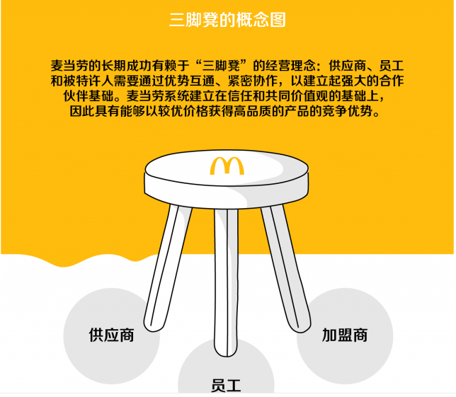 在麥當(dāng)勞著名的“三腳凳”文化中,供應(yīng)商、被特許人和麥當(dāng)勞被視為缺一不可的組成部分,三者在共同的價(jià)值觀下,優(yōu)勢(shì)互通、緊密協(xié)作。